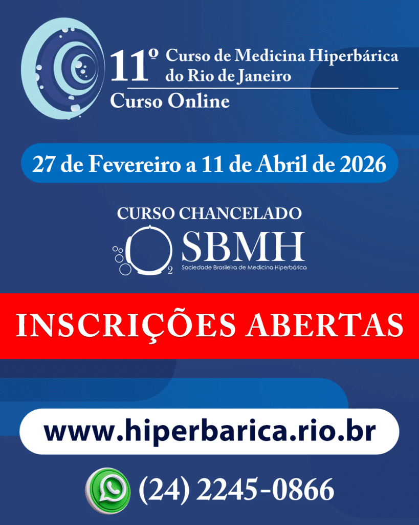 27 de fevereiro de 2026 às 08:00 - 11 de abril de 2026 às 17:00De 27 de fevereiro a 11 de abril de 2026 realizaremos o 11º do Curso de Medicina Hiperbárica do Rio de Janeiro em edição 100% Online, dividido em cinco módulos,